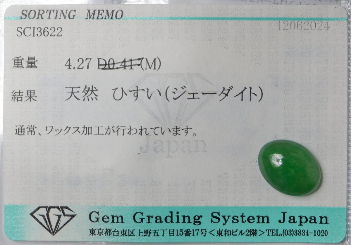 【100円~】 天然ヒスイ ルース 4.2ct ソーティング付きの詳細情報